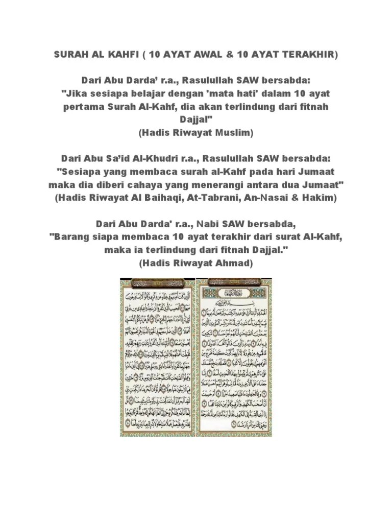 Hadits rasulullah menyebutkan seseorang yang membaca sepuluh ayat terakhir surat al kahfi akan terhindar dari fitnah dajjal. Hadits rasulullah menyebutkan seseorang yang membaca sepuluh ayat terakhir surat al kahfi akan terhindar dari fitnah dajjal.